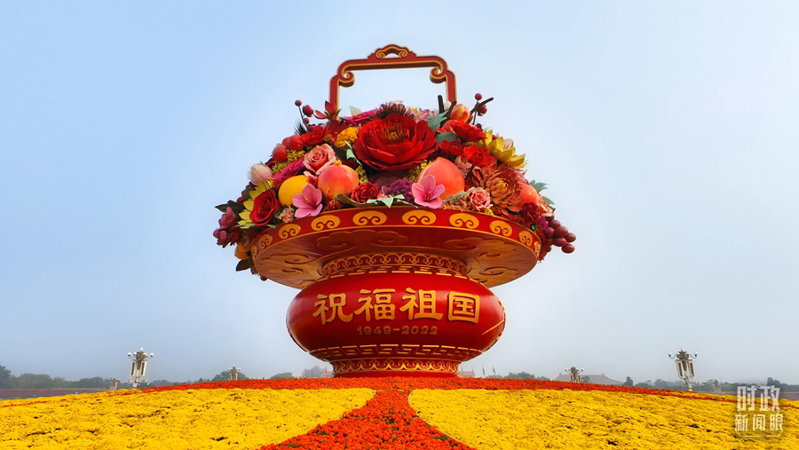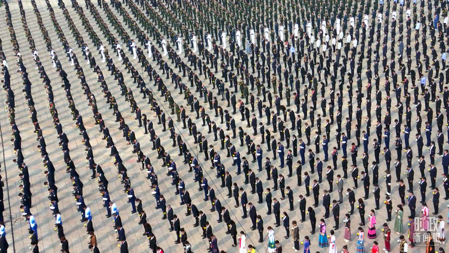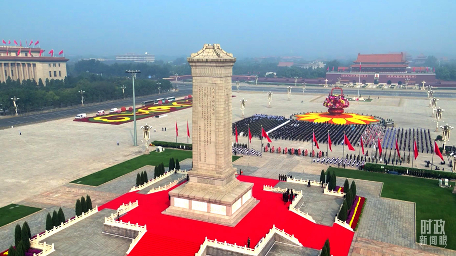 式现场△仪,走到庆祝碑前各界代表顺次,中鲜花献上手。东、国广记者李晋拍摄(总台央视记者闫耀)
