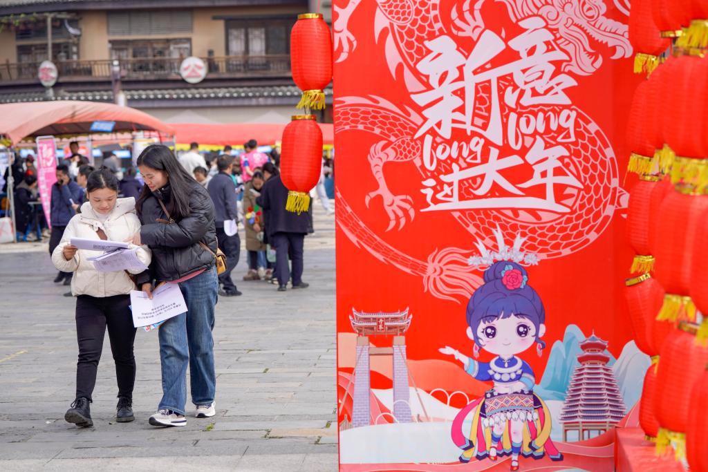 19日2月,“东风作为”暨东西部劳务合营任用会上了然岗亭音信求职者正在贵州省黔东南苗族侗族自治州丹寨县万达幼镇。(杨胜贤摄新华社发)
