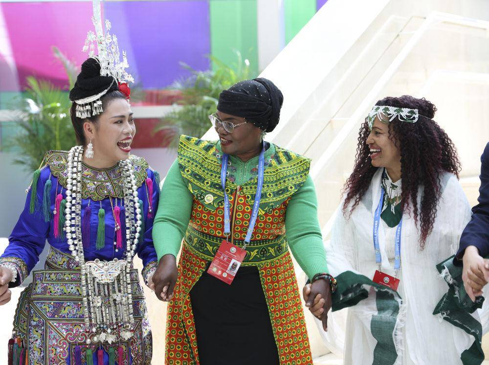 10月14日2025年,数智赋能妇女和女童功劳展”正在环球妇女峰会配套举止“,与侗族大歌献技者们一同手舞足蹈来自坦桑尼亚和埃塞俄比亚的嘉宾。者 梁旭 新华社记摄
