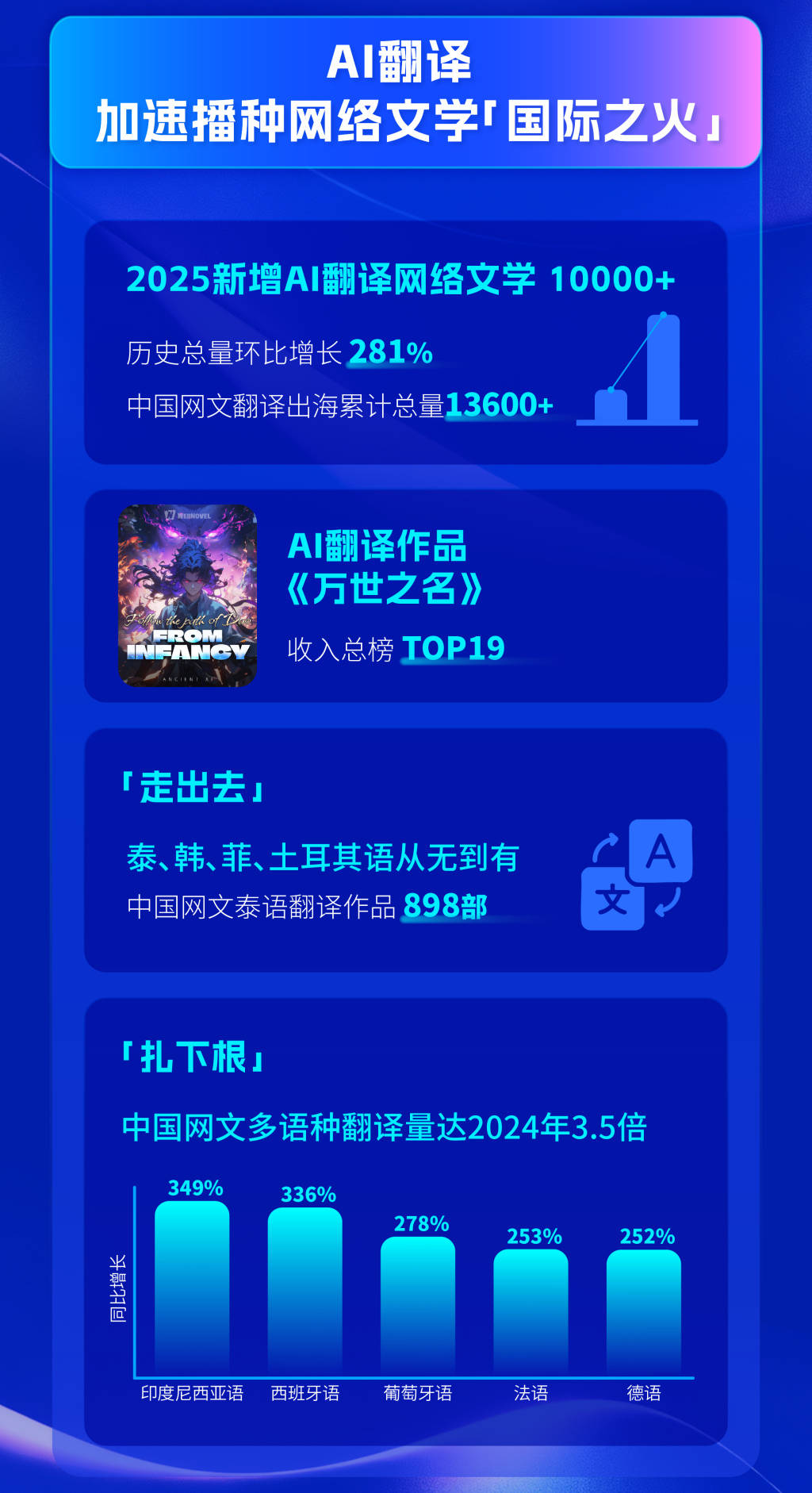 网文出海插上了羽翼AI本事的赋能则为。l新增AI翻译作品超1万部2025年WebNove,比增进281%史乘总周围环,种翻译作品周围同比增幅均超270%西班牙语、葡萄牙语等拉美区域紧要语,高效触达环球读者让中国网文故事。IP通过动画、影视等多元改编而《诡秘之主》《斗破苍穹》等,功劳超高口碑正在环球平台,画IMDb开分9.3个中《诡秘之主》动,人次过万的国漫成为首个评分。
